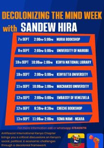 The antifascist international Kenya Chapter with the support of the embassy of Venezuela in Kenya are organizing a weeklong critical discussions with Sandew Hira on Kenya’s social, political and economic challenges through a decolonial framework. Hira will deal with the following topics: